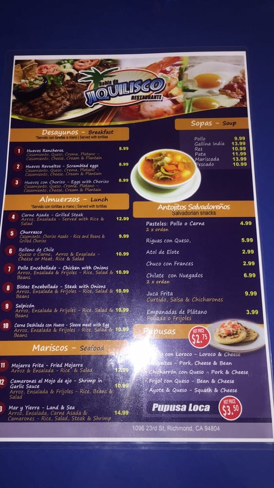 La Bahia De Jiquilisco in Richmond, CA offers a taste of authentic Salvadoran cuisine with a wide range of options to choose from. With positive reviews highlighting the generous portions, flavorful papusas, and traditional dishes like sopa de patas, this spot is a must-try for those looking for a hearty meal. The restaurant provides a cozy setting for dining in, with outdoor seating available, and also offers convenient options for takeout and delivery. Customers praise the attentive customer service and the refreshing horchata drink. Whether you're a vegetarian or a meat lover, La Bahia De Jiquilisco has something to satisfy every palate. Don't miss out on this hidden gem serving up delicious Salvadoran fare in the heart of Richmond.